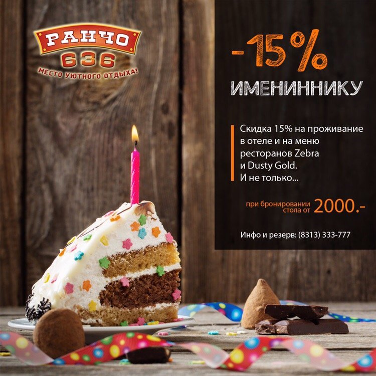 Скидка именинникам 15%: номер в отеле, рестораны, баня